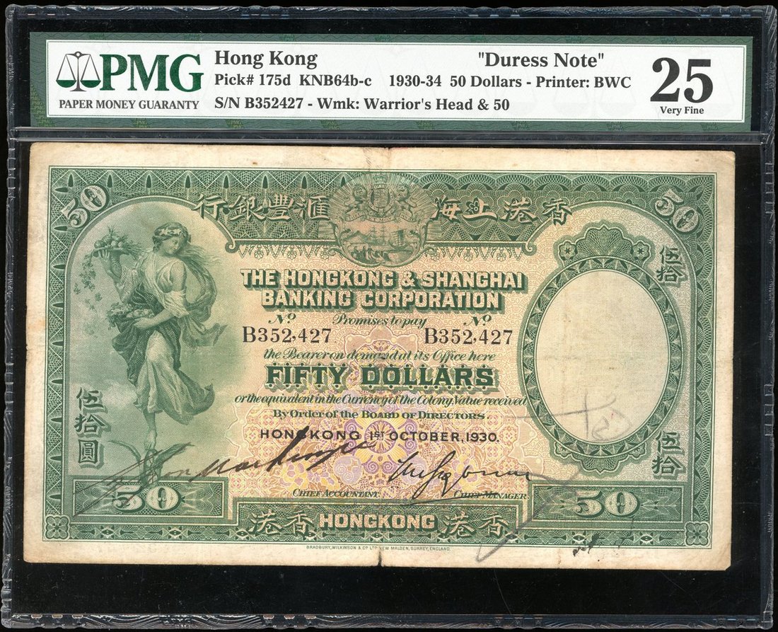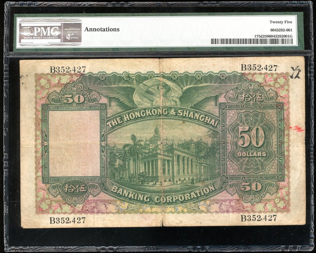 1930年匯豐銀行50元,編號B352427,PMG 25,有書寫,品相上佳的原裝紙