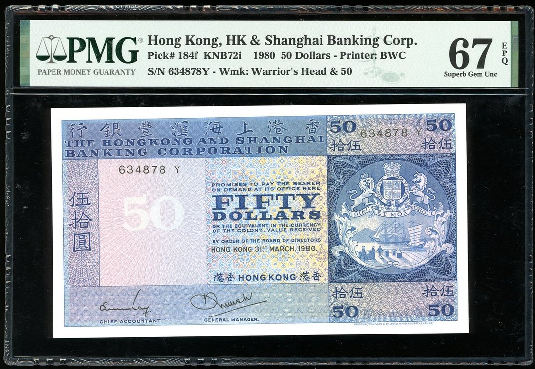 The Hongkong and Shanghai Banking Corporation, $50, 31.3.1980, serial number 634878Y, (Pick 184f), PMG 67EPQ Superb Gem Uncirculated