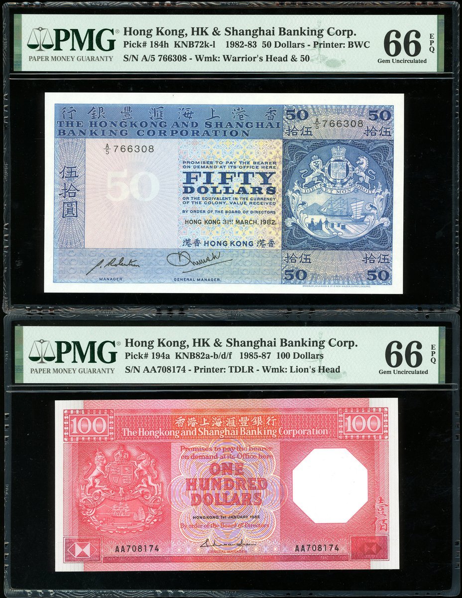 1982年匯豐銀行50元,編號A/5 766308及1985年100元,編號AA708174,均評PMG66EPQ