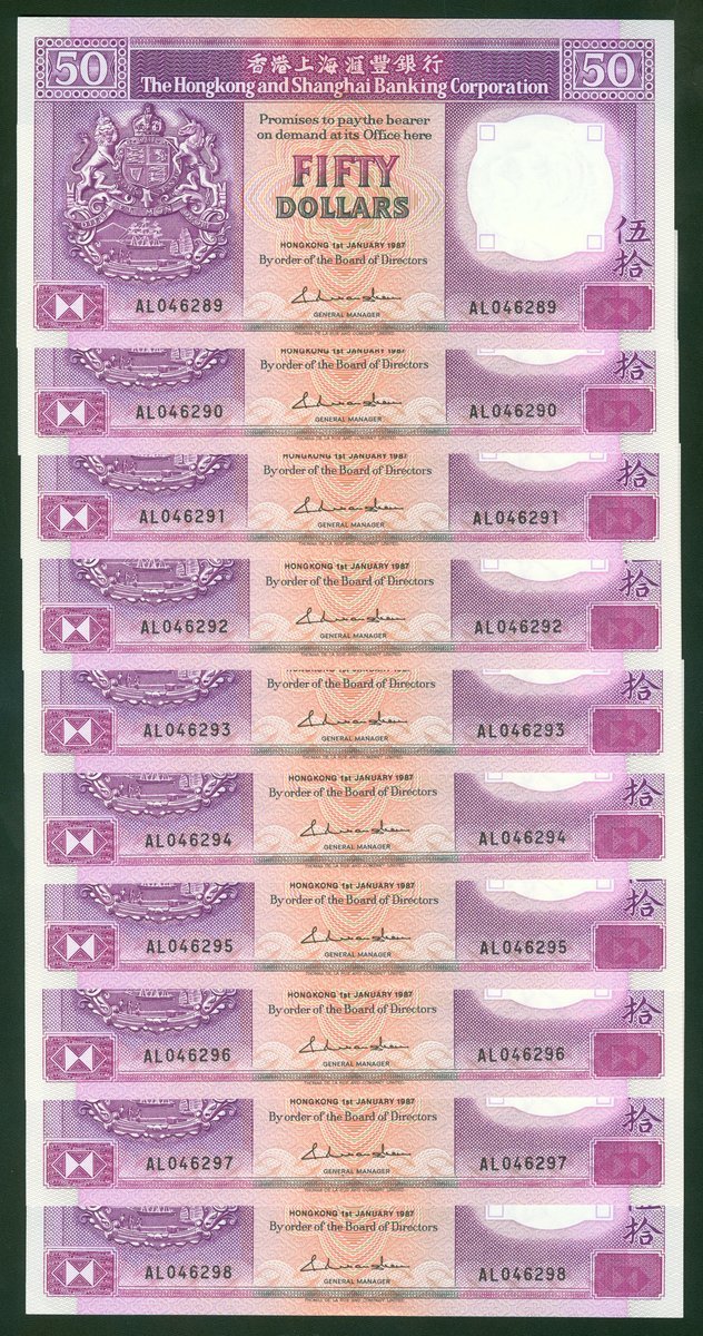 The Hongkong and Shanghai Banking Corporation, $50, 1.1.1987, consecutive run of 10 notes, serial number AL046289 to 298, (Pick 193a), uncirculated (10)