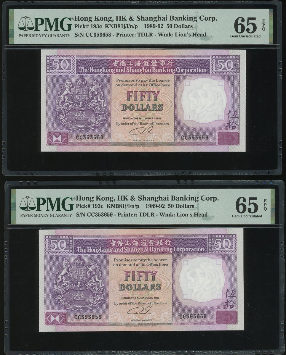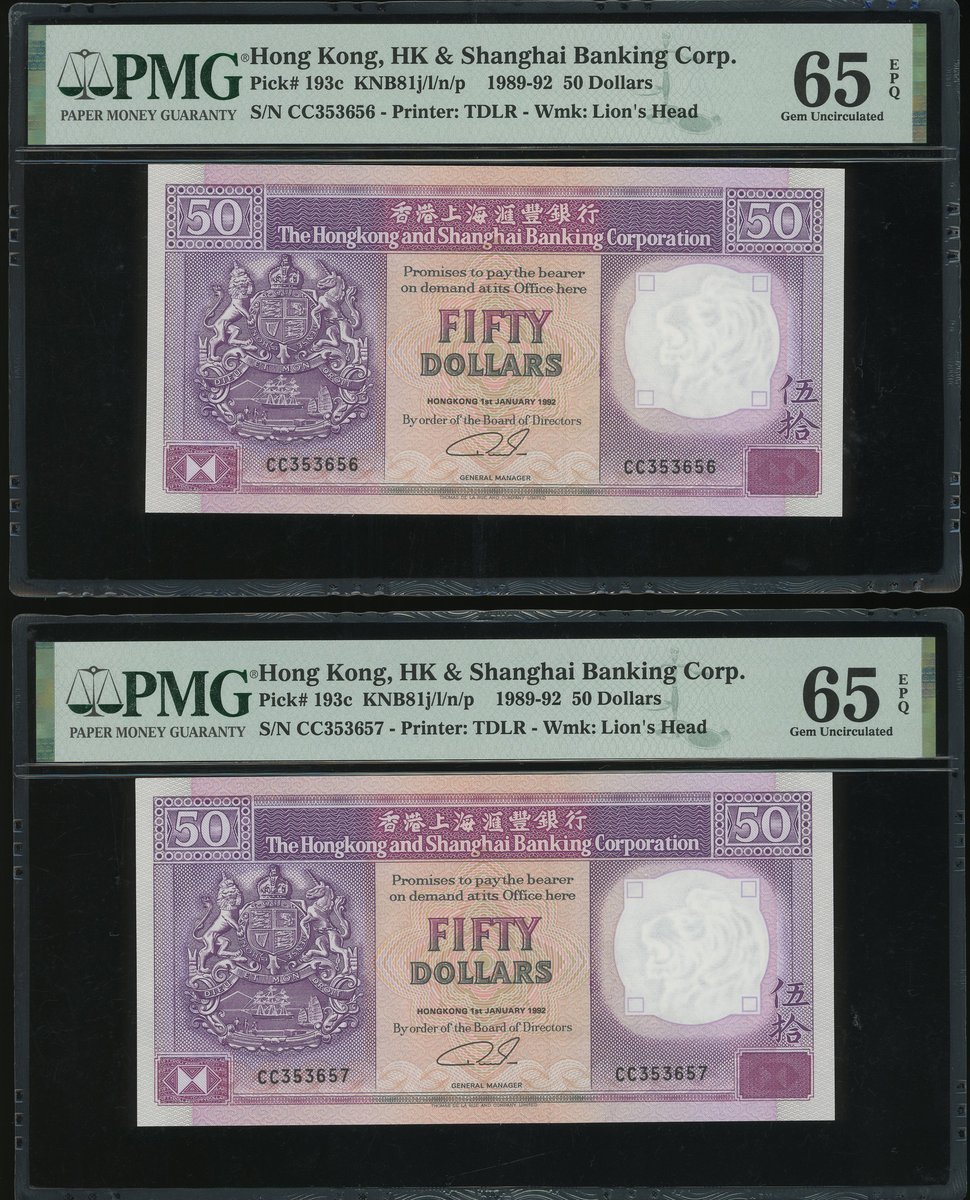 1991及92年匯豐銀行50元一組5枚,編號BQ051270及CC353656-9,首枚評PMG 67EPQ,其餘65EPQ