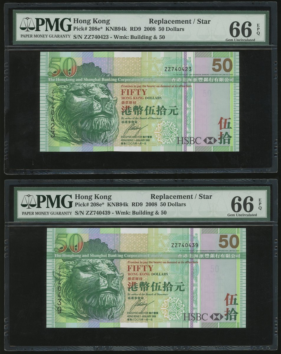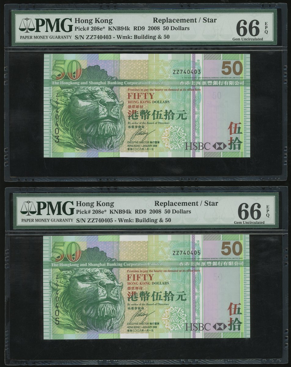 The Hongkong and Shanghai Banking Corporation, 4x $50, 1.1.2008, replacement serials ZZ740403, 405, 423 and 439, (Pick 208e*), all graded PMG 66EPQ Gem Uncirculated (4)