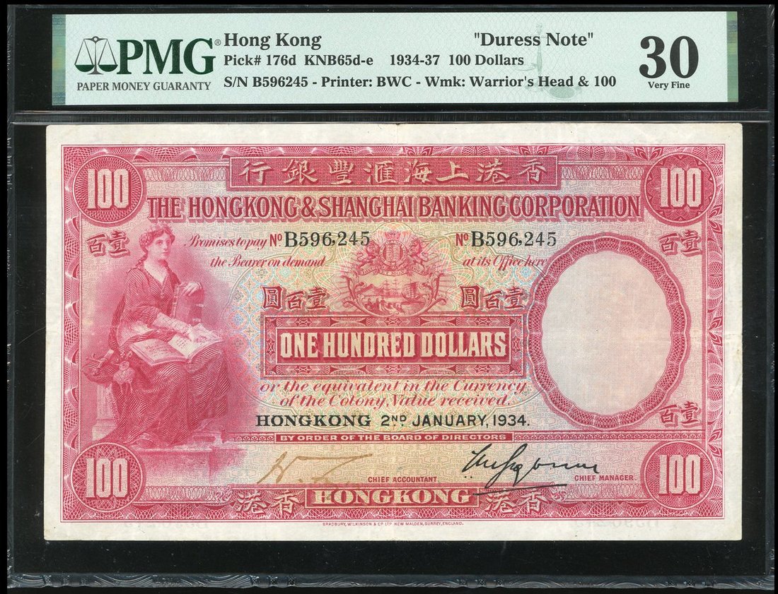 1934年匯豐銀行100元,編號B596245,PMG 30