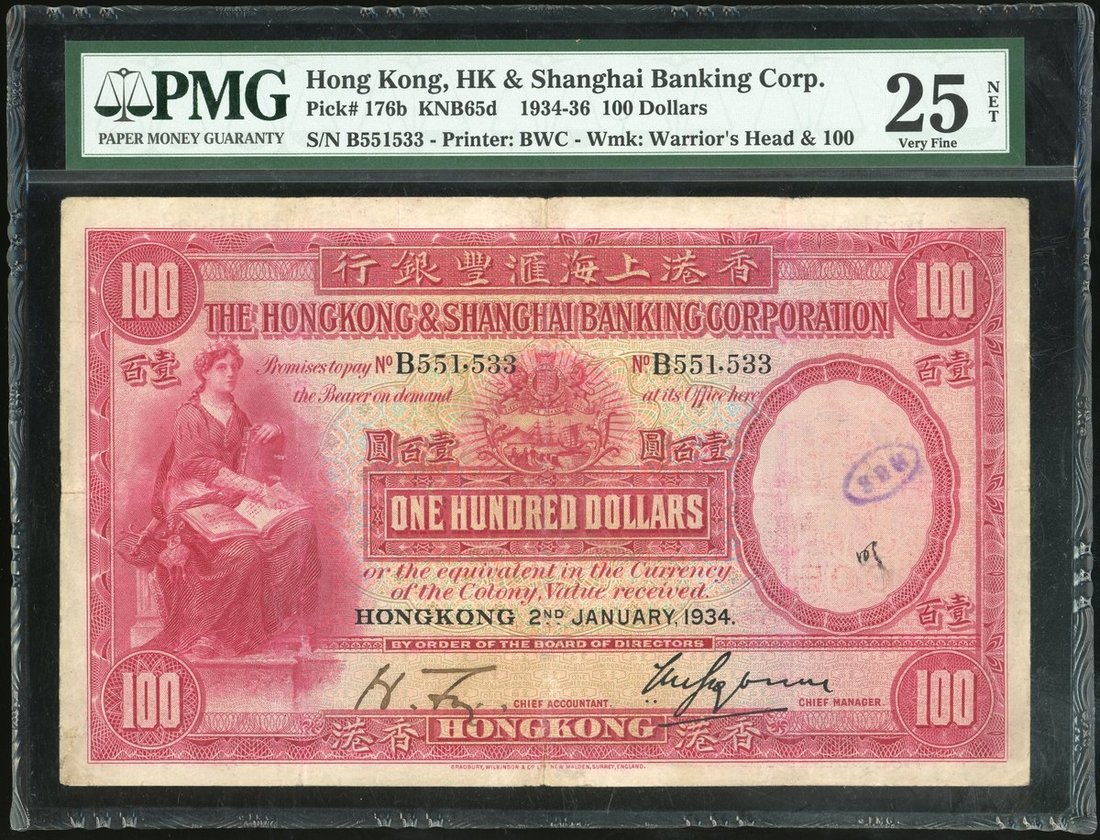 The HongKong and Shanghai Banking Corporation, $100, 2.1.1934, serial number B551533, red on multicoloured underprint, maiden at left, arms top centre, value at centre and each corner, manuscript signatures at bottom, reverse red, bank building at centre, angel above, serial number at four corners, handsigned at lower left,