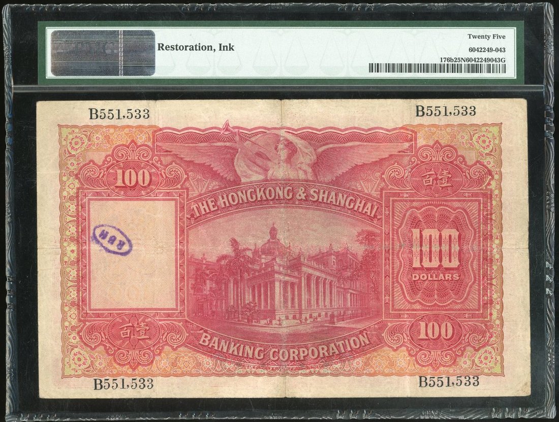 1934年匯豐銀行100元,編號B551533,PMG 25NET,有修復及墨漬