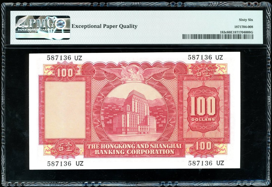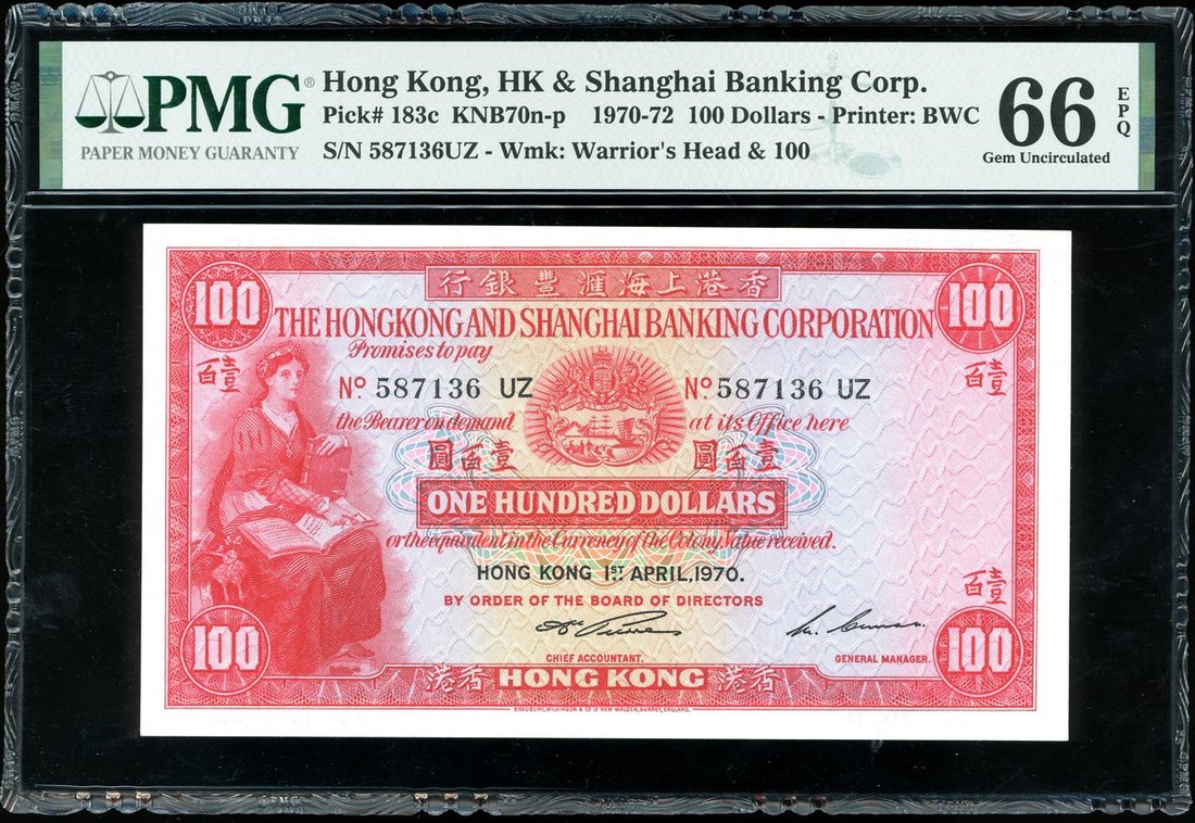 The Hongkong and Shanghai Banking Corporation, $100, 1.4.1970, serial number 587136 UZ, (Pick 183c), PMG 66EPQ Gem Uncirculated