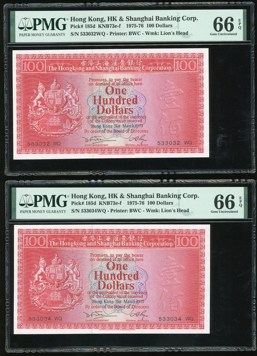 The HongKong and Shanghai Banking Corporation, $100, 31.3.1975, serial number 533032 and 533034 WQ, (Pick 185d), both graded PMG 66EPQ (2)