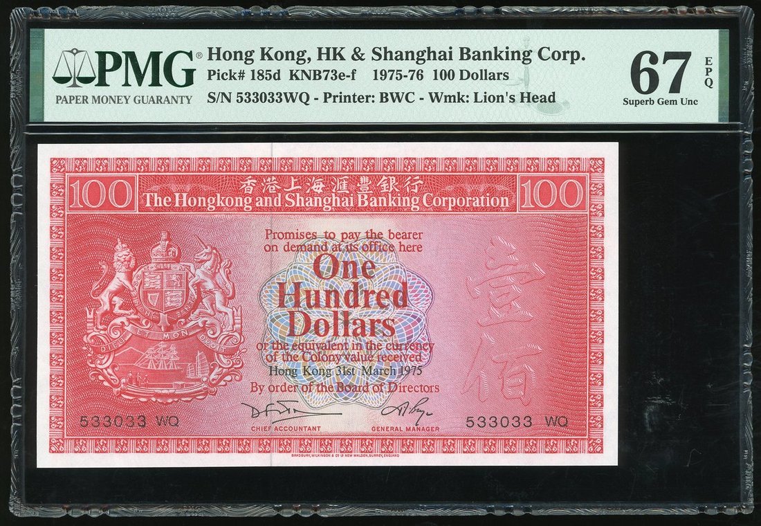 The HongKong and Shanghai Banking Corporation, $100, 31.3.1975, serial number 533033 WQ, (Pick 185d), PMG 67EPQ Superb Gem Uncirculated and choice