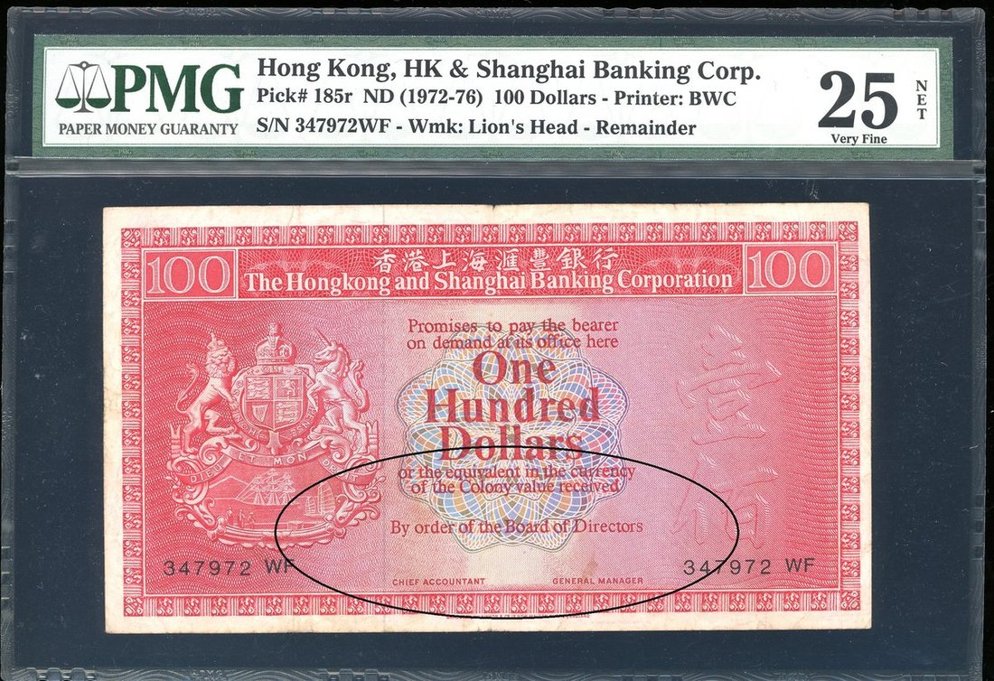 匯豐銀行100元,編號347972WF,漏印日期及簽名錯體,PMG25NET, 有裂,不過PMG評級上沒有注明此錯體,故售後不可作為退貨之理由