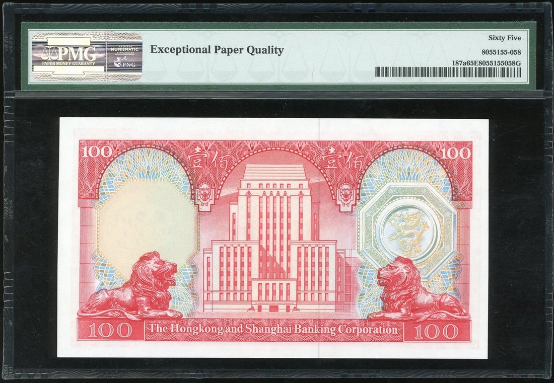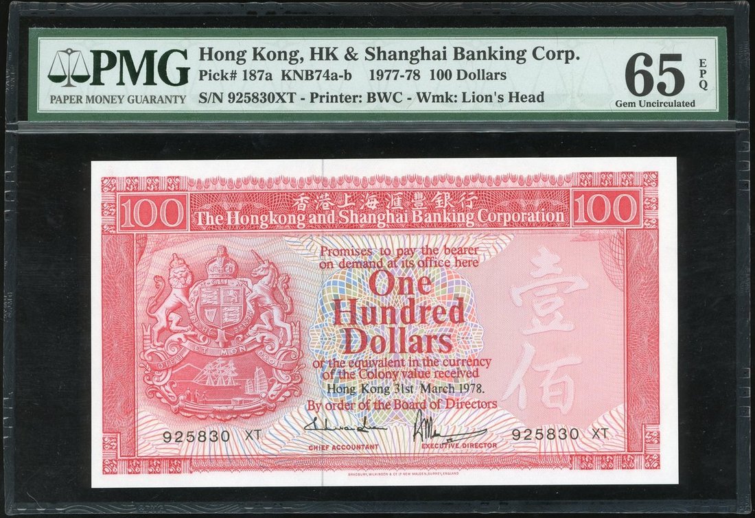 The HongKong and Shanghai Banking Corporation, $100, 31.3.1978, serial number 925830 XT, (Pick 187a), PMG 65EPQ Gem Uncirculated