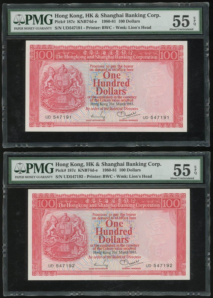 The Hongkong and Shanghai Banking Corporation, a consecutive pair of $100, 31.3.1981, serial numbers UD547191-192, (Pick 187c), both graded PMG 55EPQ About Uncirculated (2)