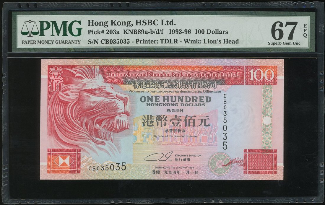 The Hongkong and Shanghai Banking Corporation, $100, 1.1.1994, repeater serial number CB035035, (Pick 203a), PMG 67EPQ Superb Gem Uncirculated