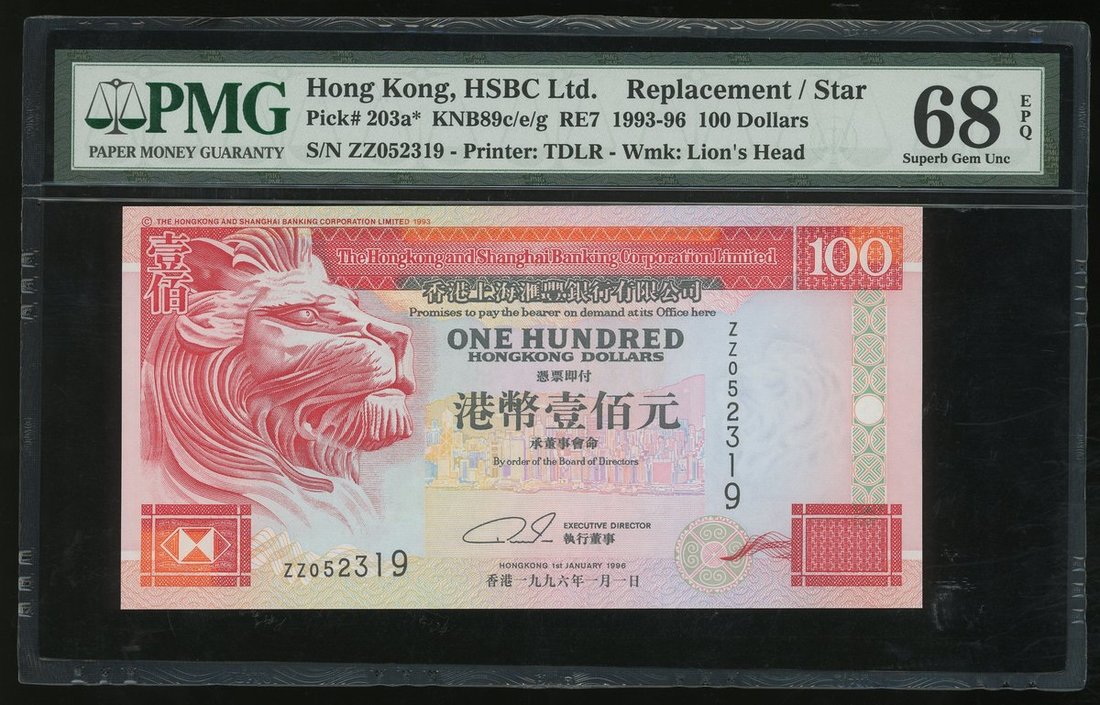 The HongKong and Shanghai Banking Corporation, $100, 1.1.1996, replacement serial number ZZ052319, (Pick 203a*), PMG 68EPQ Superb Gem Uncirculated and choice, key date of the series