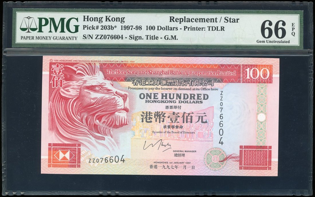 The Hongkong and Shanghai Banking Corporation, $100, 1.1.1997, replacement serial ZZ076604, (Pick 203b*), PMG 66EPQ Gem Uncirculated