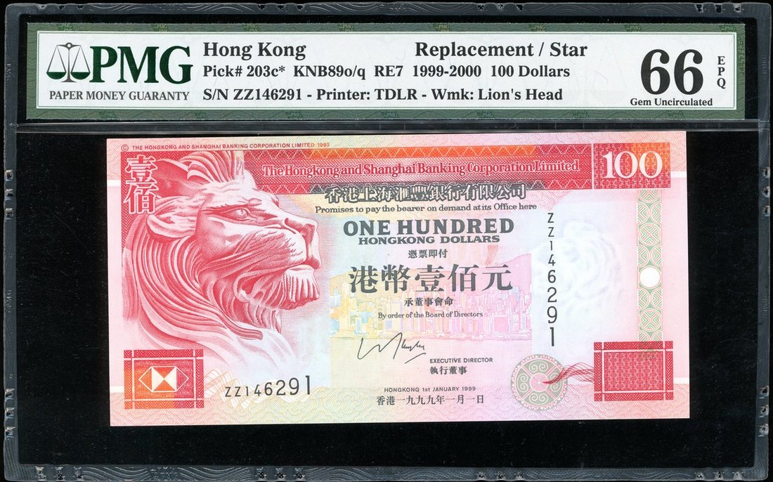 The Hongkong and Shanghai Banking Corporation, $100, 1.1.1999, replacement serial ZZ146291, (Pick 203c*), PMG 66EPQ Gem Uncirculated