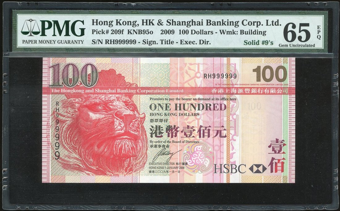 2009年匯豐銀行100元,幸運號RH999999,PMG 65EPQ