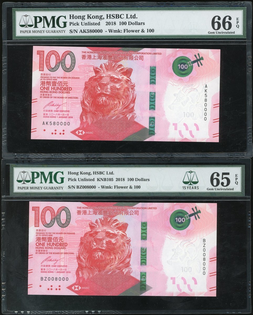 The HongKong and Shanghai Banking Corporation, $100, 1.1.2018, a group of 3 fancy serial numbers AK580000, BZ008000 and CH008000, (Pick new), graded PMG 66EPQ, 65EPQ and 66EPQ respectively (3)