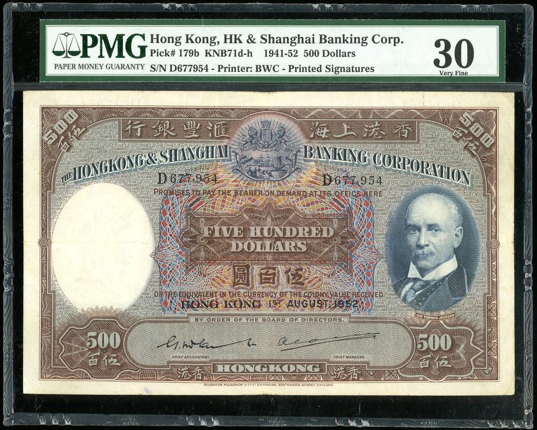 The Hongkong and Shanghai Banking Corporation, $500, 1.8.1952, serial number D677954, brown, blue and multicoloured, Sir Thomas Jackson at right, coat of arms top centre, watermark of a woman in classical style at left, reverse blue, bust of woman at left and old HSBC building at centre,