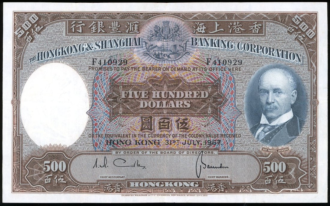 The Hongkong and Shanghai Banking Corporation, $500, 31.7.1967, serial number F410929, brown, blue and multicoloured, Sir Thomas Jackson at right, coat of arms top centre, watermark of a woman in classical style at left, reverse blue, bust of woman at left and old HSBC building at centre,
