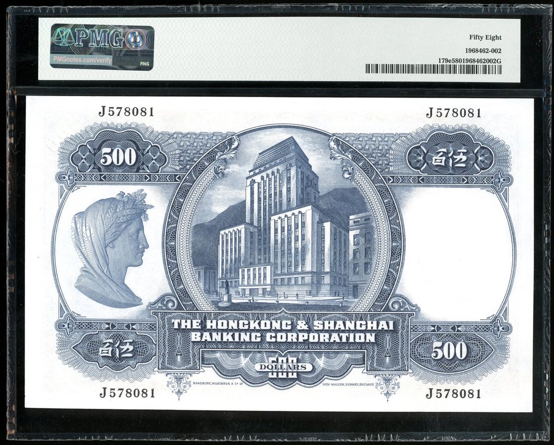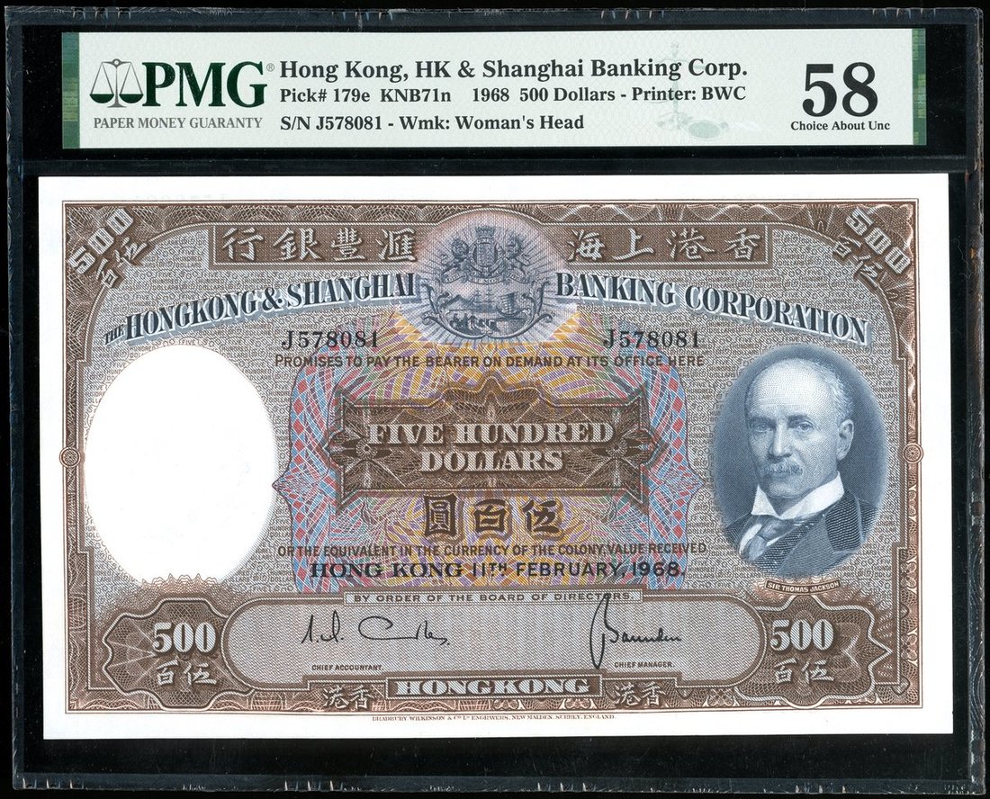 1968年匯豐銀行500元,編號J578081,PMG 58