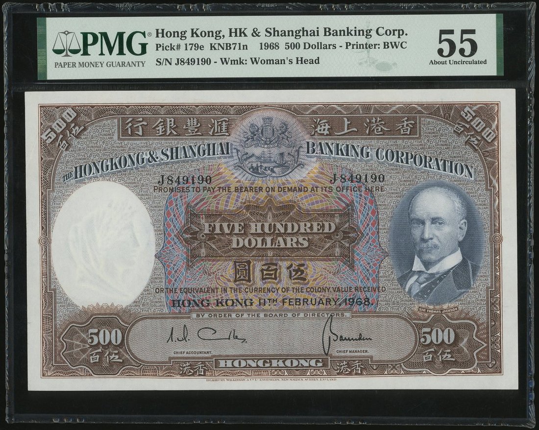 1968年匯豐銀行500元,編號J849190,PMG 55