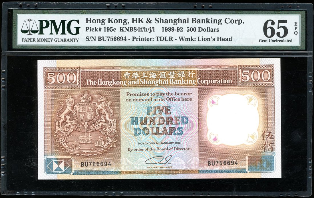 The Hongkong and Shanghai Banking Corporation, $500, 1.1.1992, serial number BU756694, (Pick 195c), PMG 65EPQ Gem Uncirculated