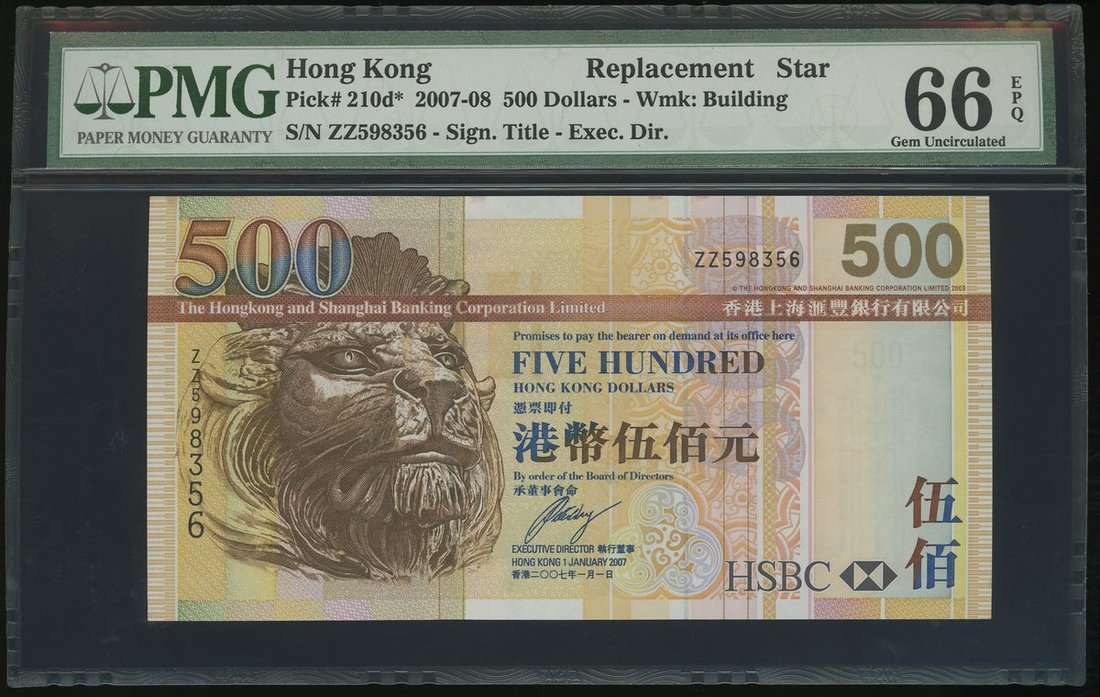 The HongKong and Shanghai Banking Corporation, $500, 1.1.2007, replacement serial number ZZ598356, (Pick 210d*), PMG 66EPQ Gem Uncirculated