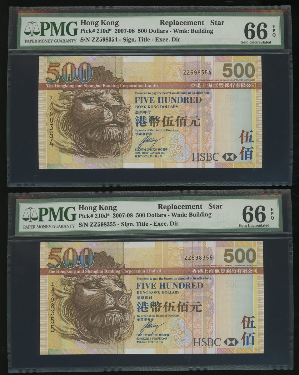 The HongKong and Shanghai Banking Corporation, $500, 1.1.2007, consecutive replacement serial numbers ZZ598354 and 355, (Pick 210d*), both graded PMG 66EPQ Gem Uncirculated (2)