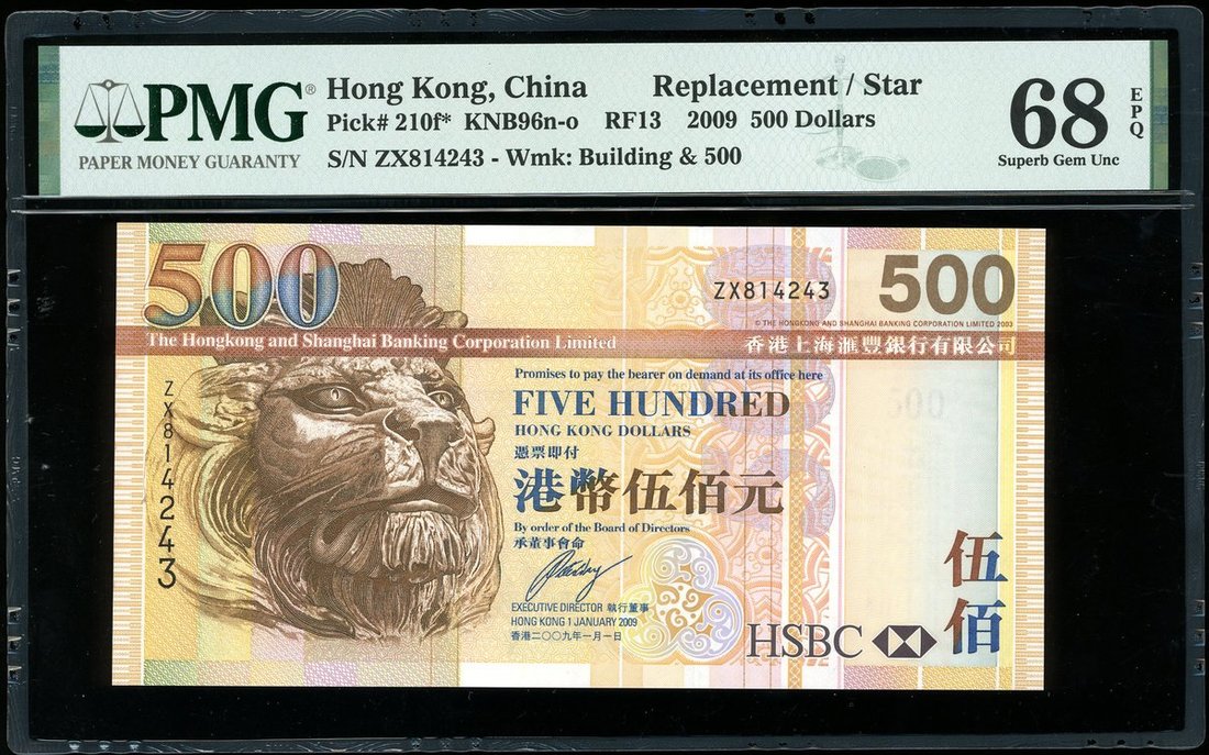 The Hongkong and Shanghai Banking Corporation, $500, 1.1.2009, replacement serial number ZX814243, (Pick 210f*), PMG 68EPQ Superb Gem Uncirculated