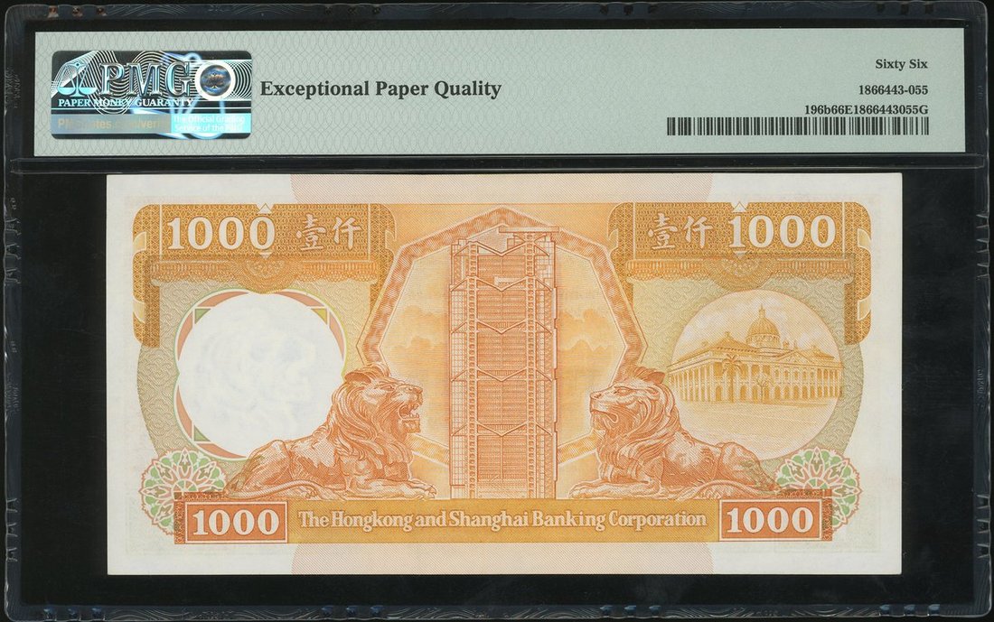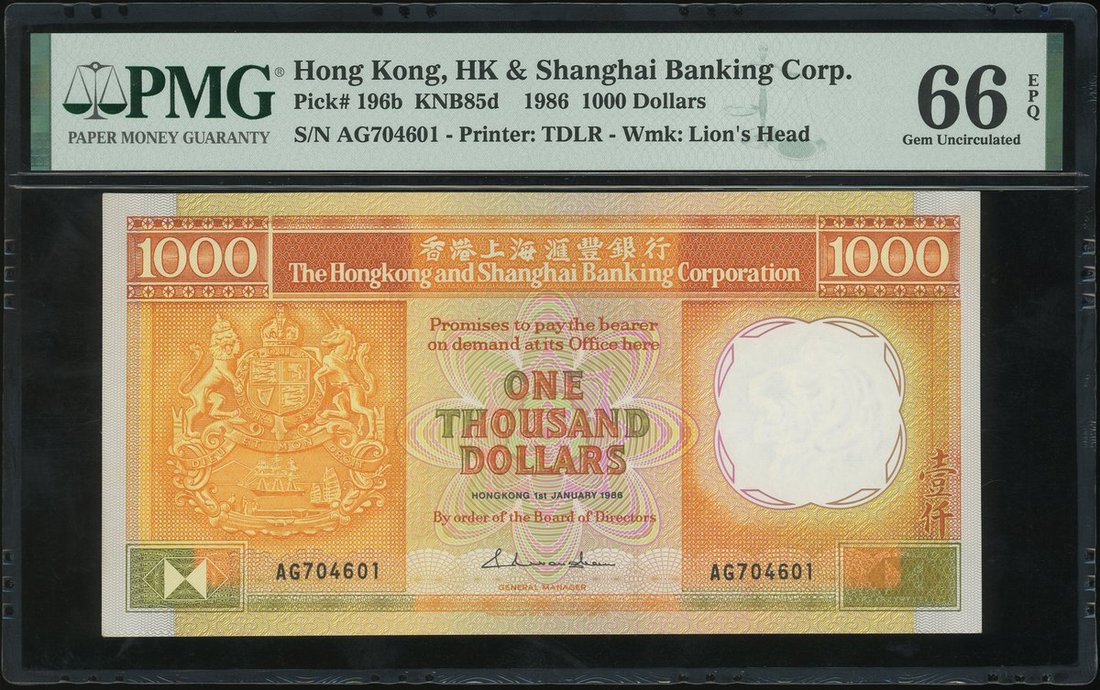 The Hongkong and Shanghai Banking Corporation, $1000, 1.1.1986, serial number AG704601, (Pick 196b), PMG 66EPQ Gem Uncirculated and scarce