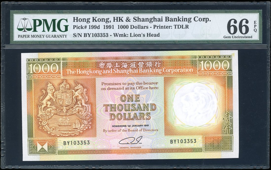 1991年匯豐銀行1000元,編號BY103353,PMG 66EPQ