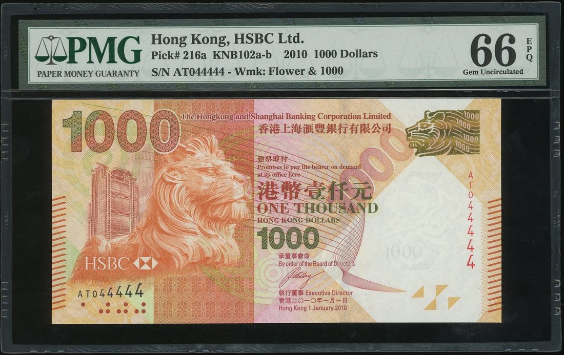 Hong Kong & Shanghai Banking Corporation, $1000, 2010, serial number AT044444, (Pick 216a), PMG 66EPQ, gem uncirculated.