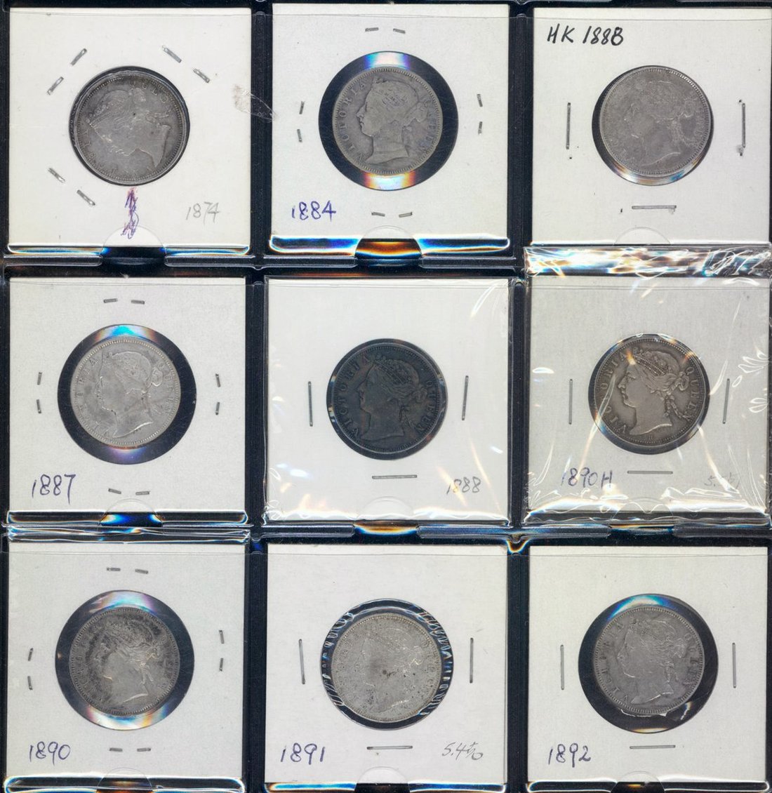 Hong Kong, group of 9 silver 20 cents, 1874, 1884, 1887, 1888 (2), 1890, 1890-H, 1891 and 1892,