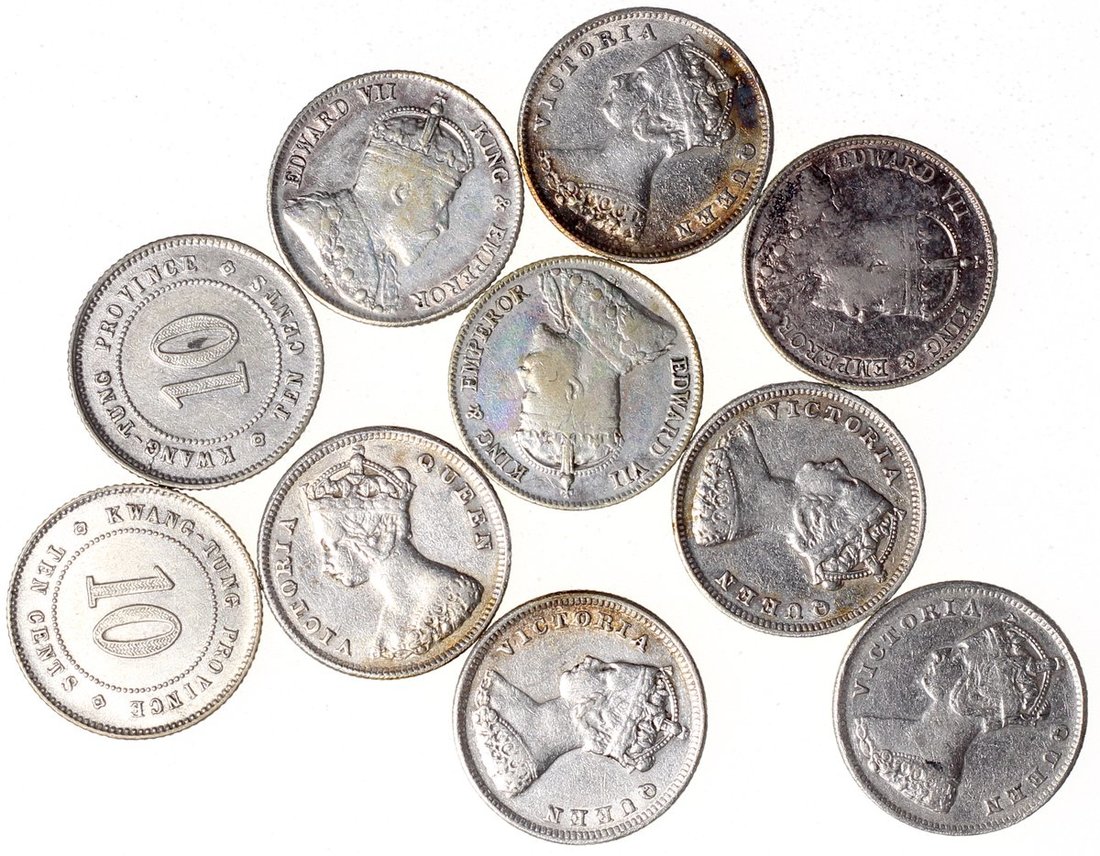 Hong Kong, group of 8 silver 10 cents, 1892, 1894, 1895, 1898, 1900, 1902, 1903 and 1904, also Kwangtung Province silver 10 cents, 1913 and 1914,