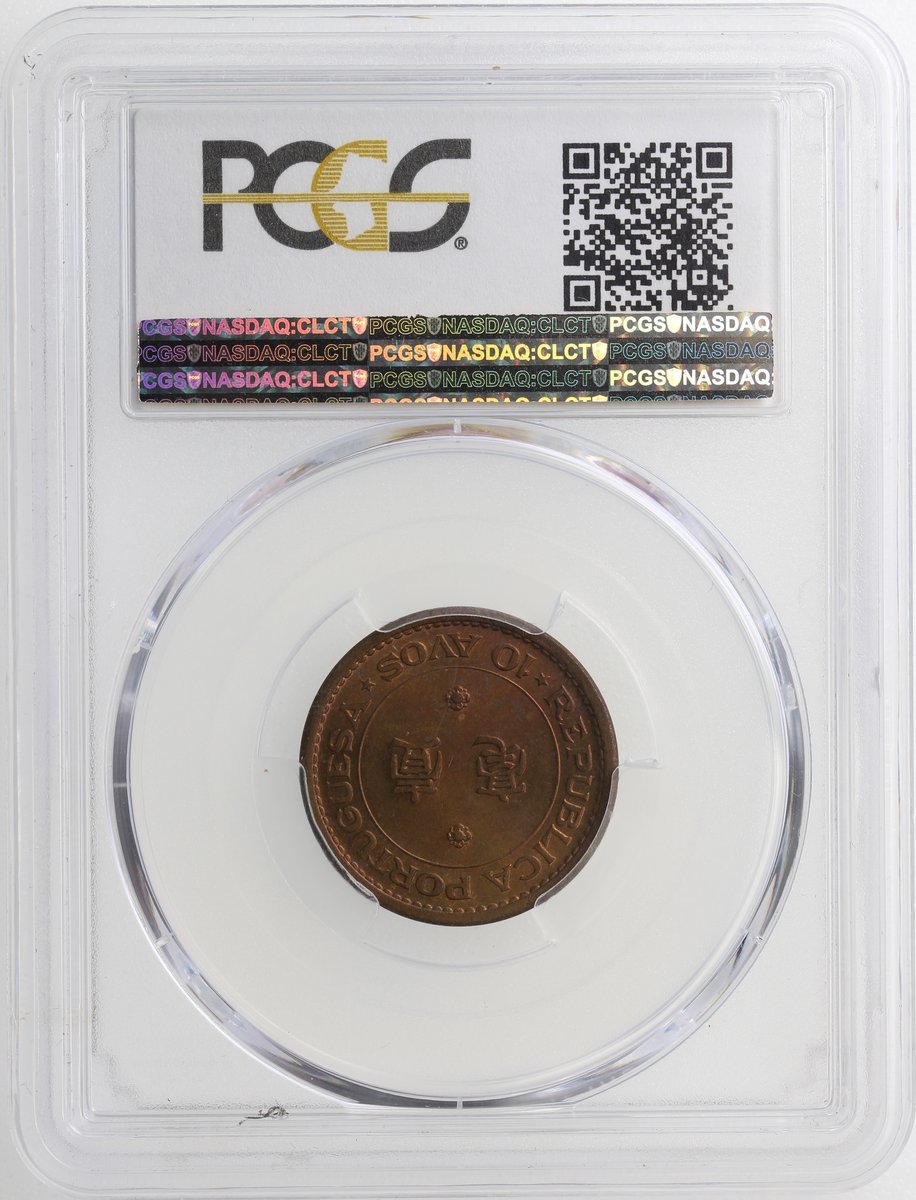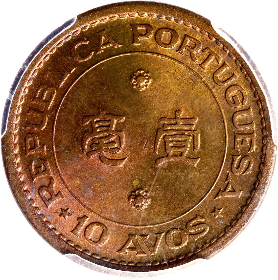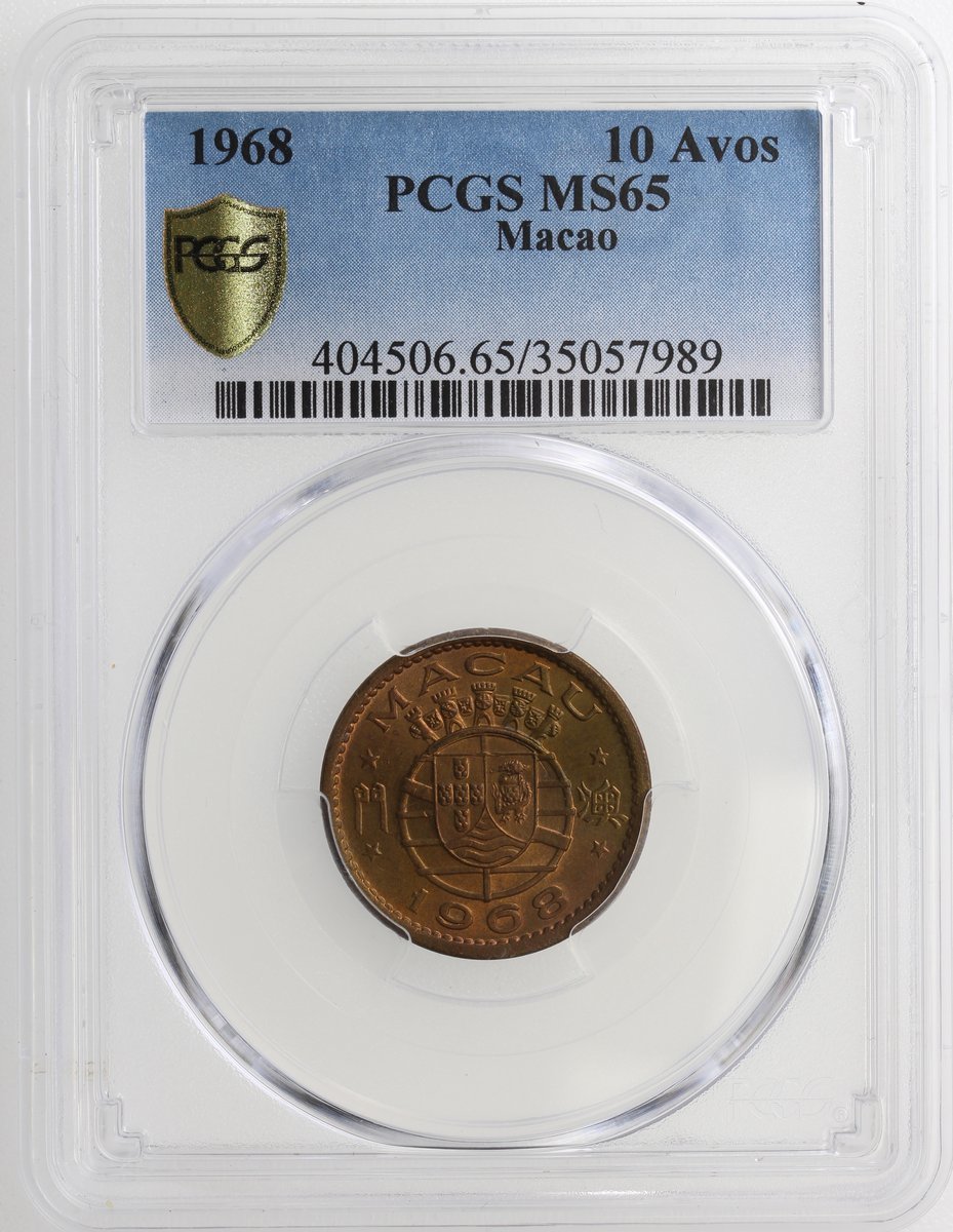Mixed lot, a Hong kong 1931 copper 1 cent and 1951 copper nickel 10 cents, together with a Macau 1968 copper 10 avos, the 1 cent graded PCGS MS65RD, the rest MS65.(3)