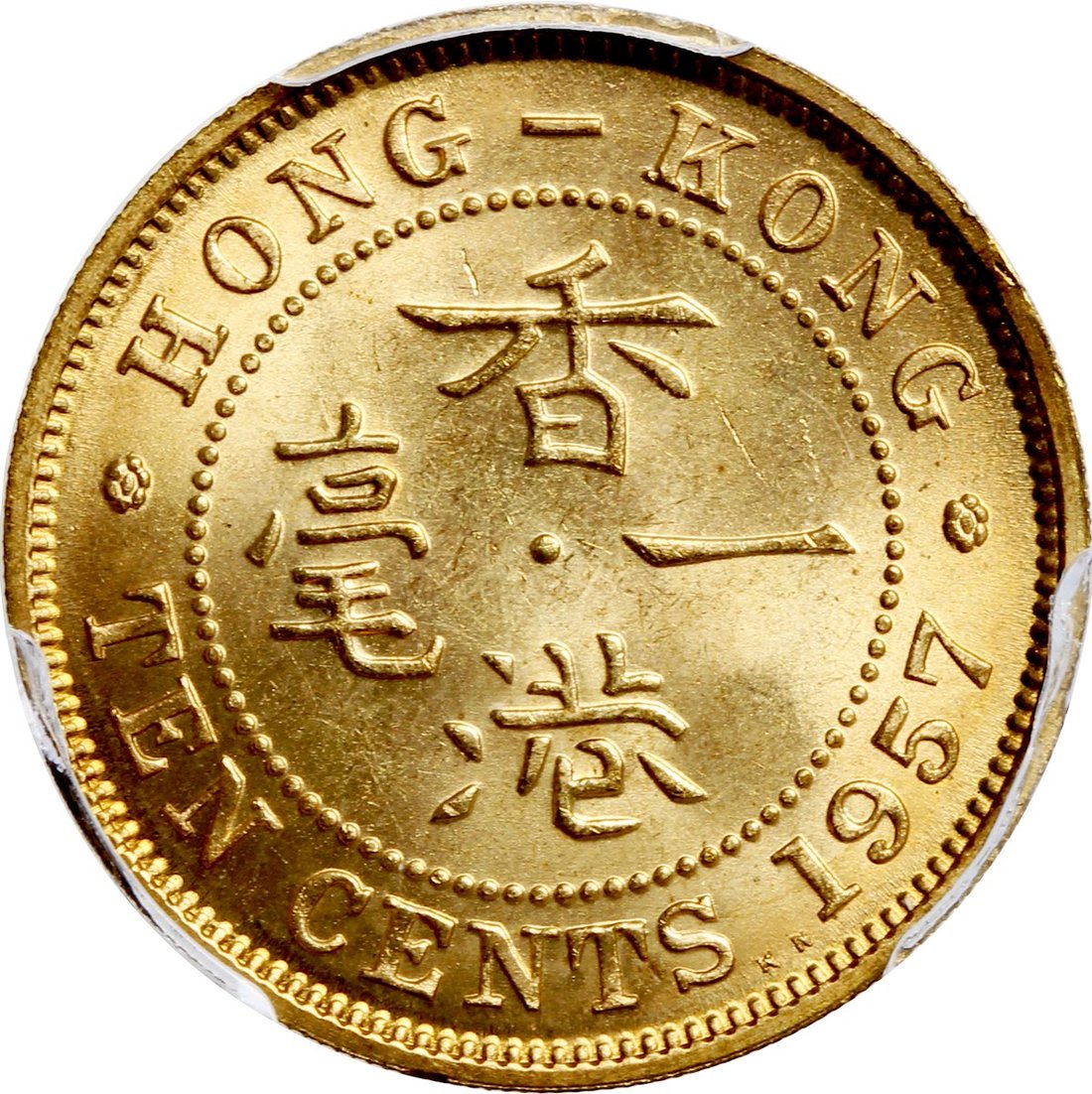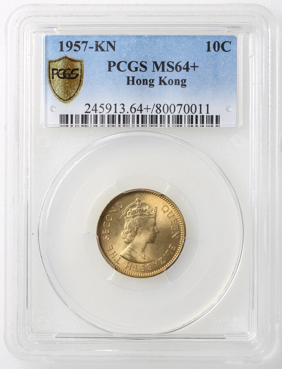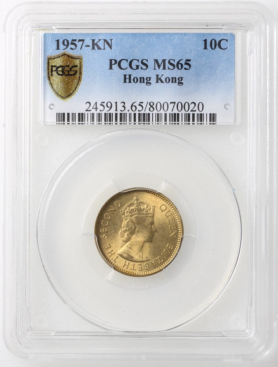Hong Kong, a trio of copper nickel 10 cents, 1956H and 2x 1957KN, PCGS graded, the 1st UNC Detail, cleaned, the rest MS64+ and MS65.(3)