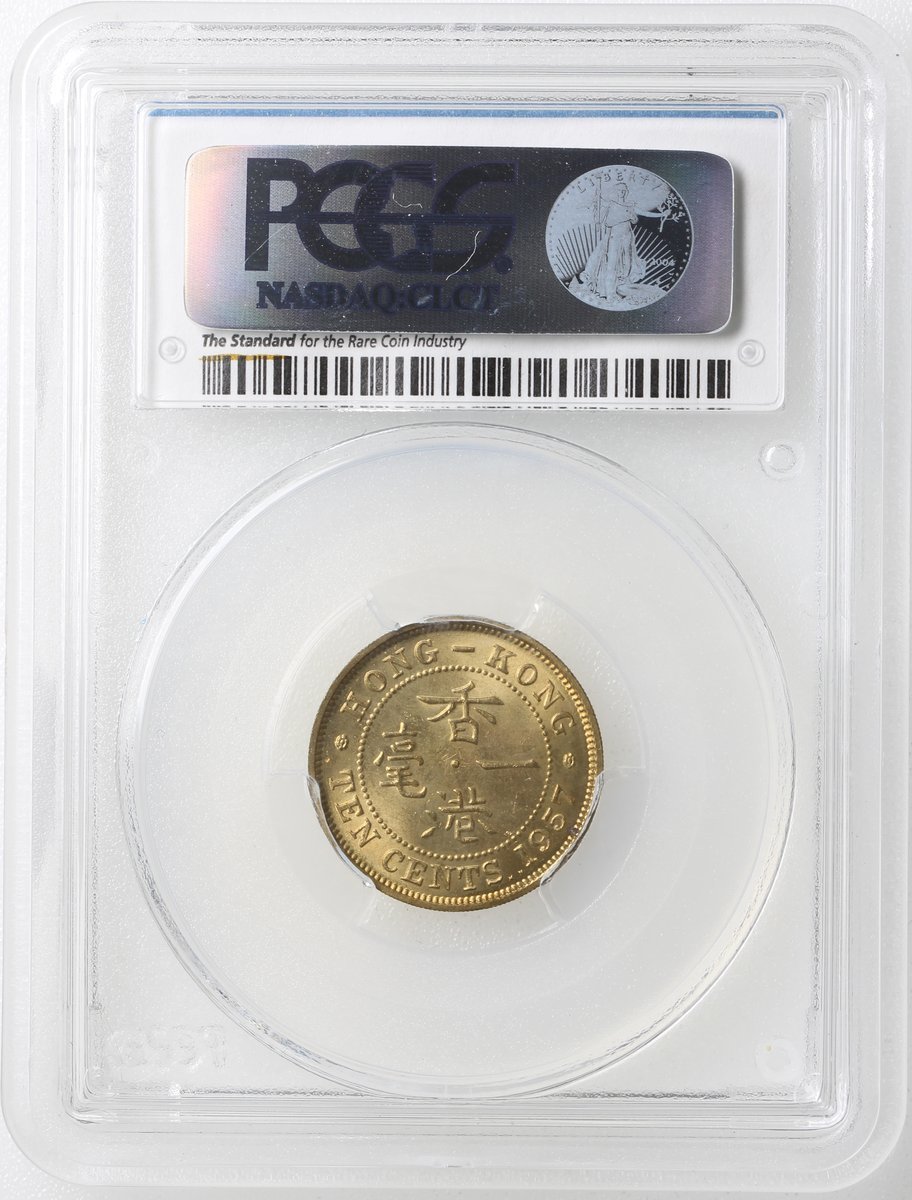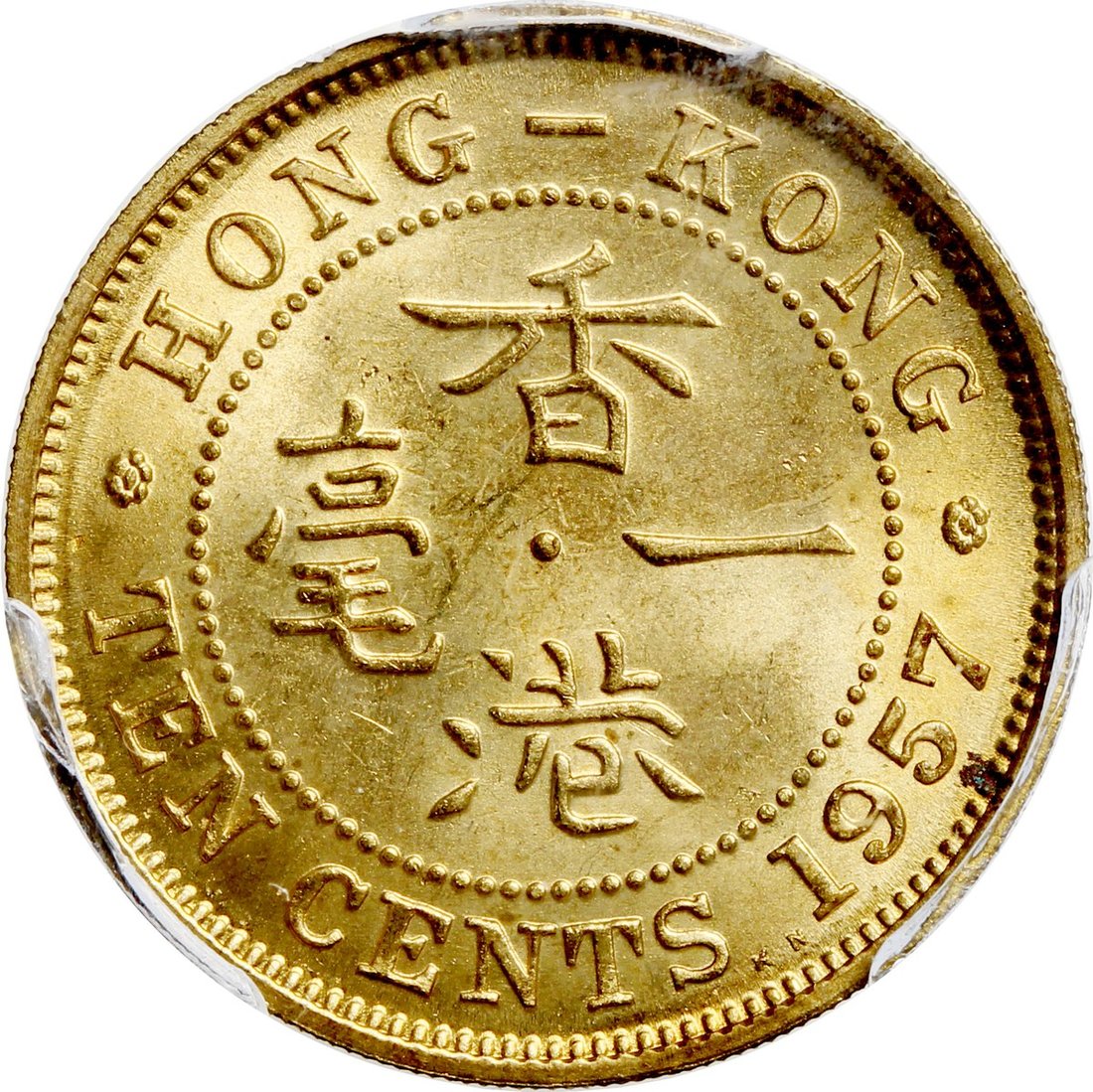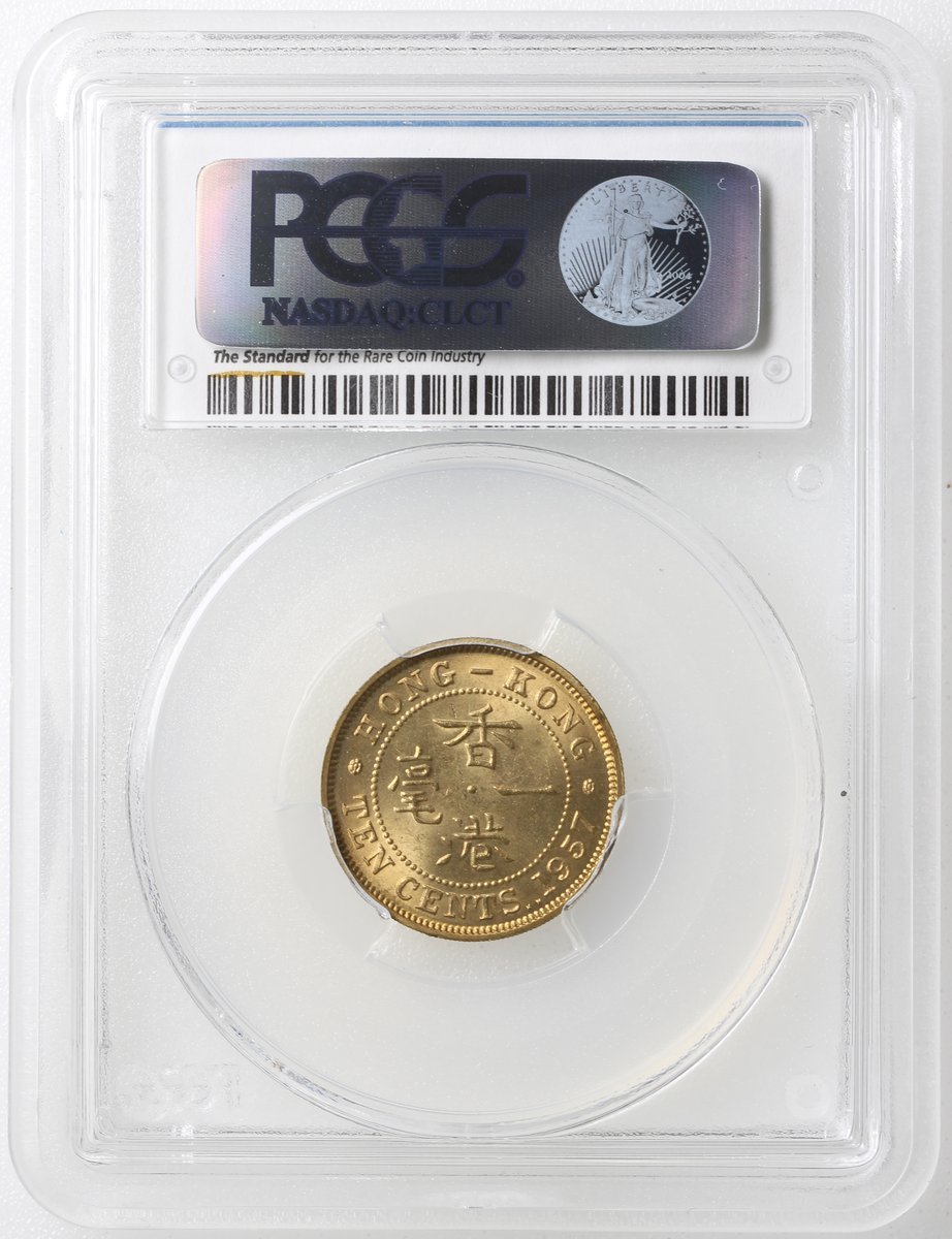 Hong Kong, a trio of copper nickel 10 cents, 1956H and 2x 1957KN, PCGS graded, the 1st UNC Detail, cleaned, the rest MS64+ and MS65.(3)