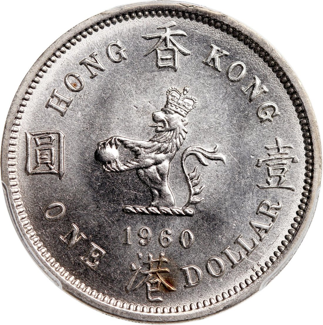 Hong Kong, copper nickel $1, 1960-KN, PCGS MS64, stain spot on reverse, key date of the series