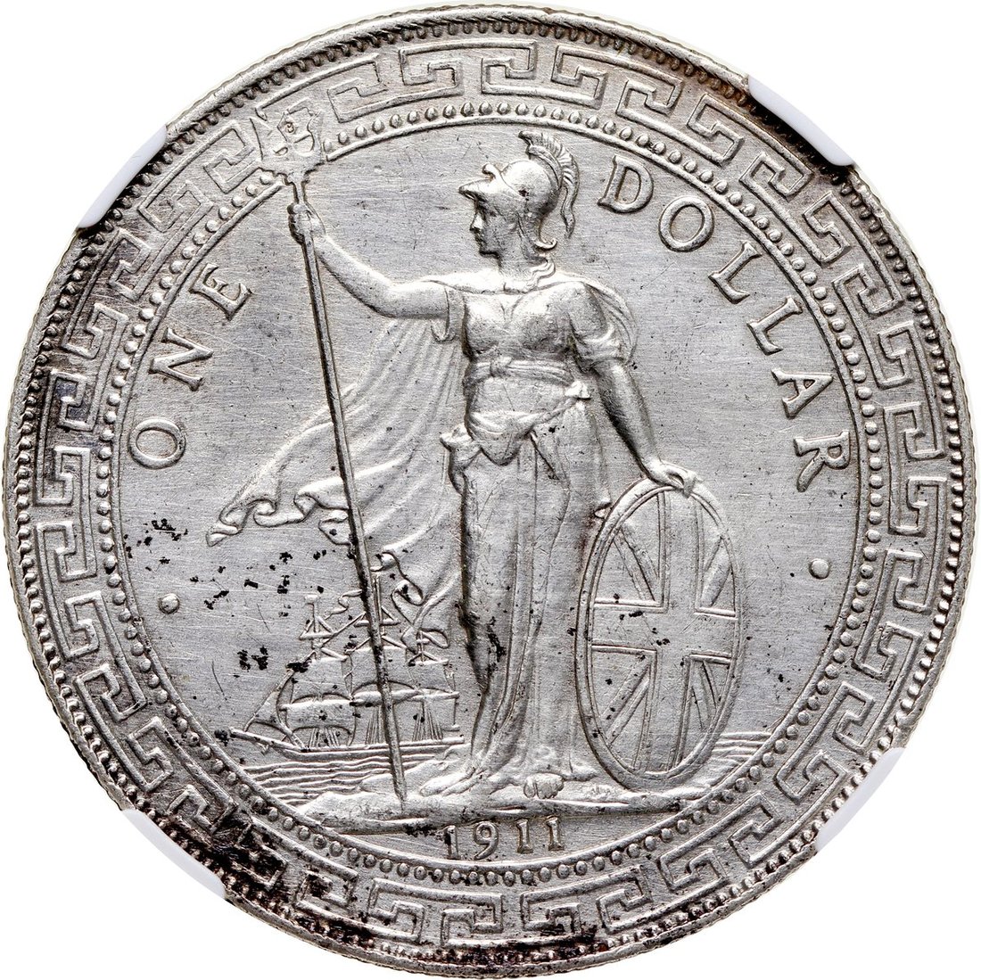 Great Britain, silver trade dollar, 1911-B, graded NGC UNC Details (Cleaned)