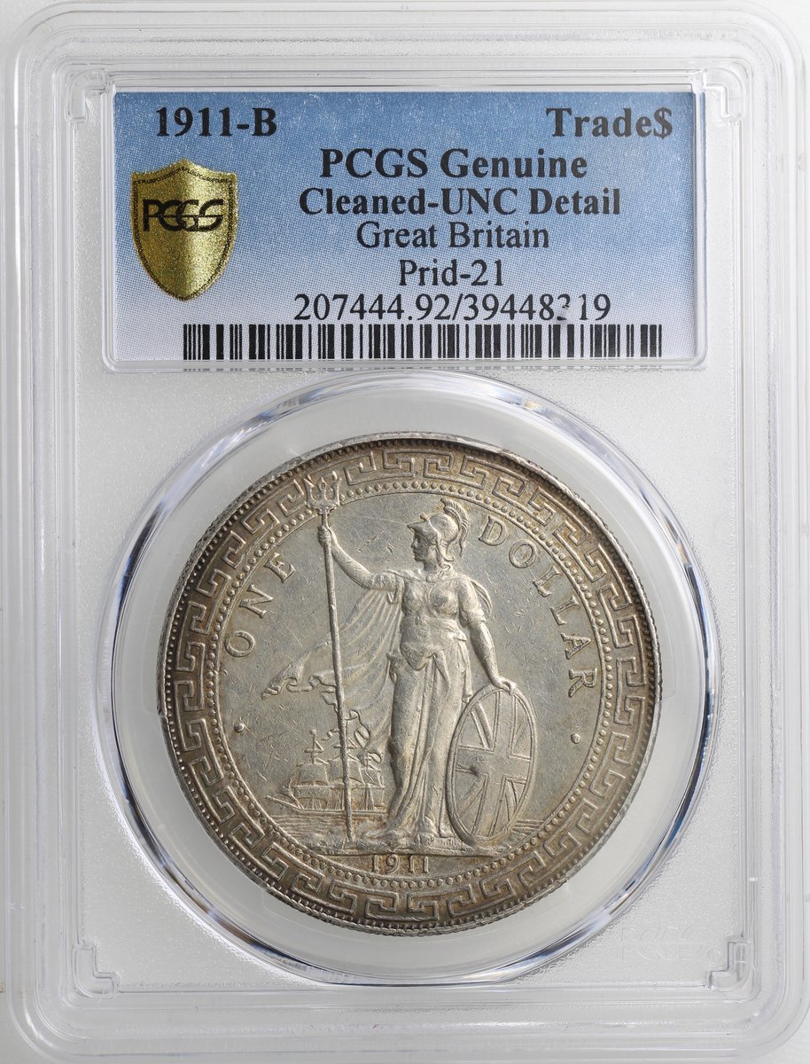 Great Britain, silver trade $1, 1911-B, (Prid-21), PCGS Genuine Cleaned - UNC Detail