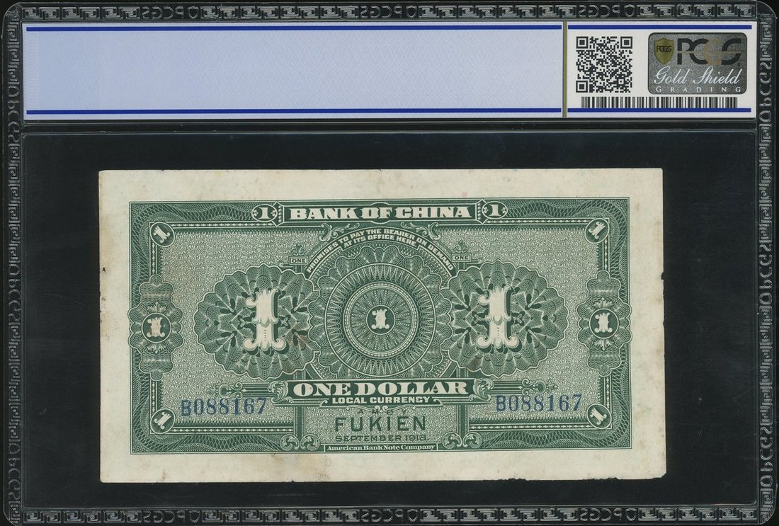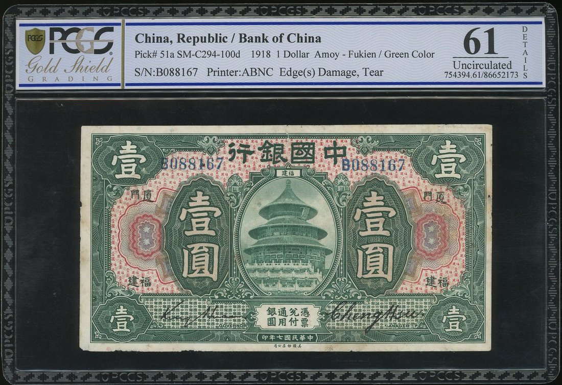 Bank of China, $1, Fukien/Amoy, 1918, serial number B088167, (Pick 51a), PCGS Gold Shield 61 Uncirculated Details (Edge(s) Damage, Tear)