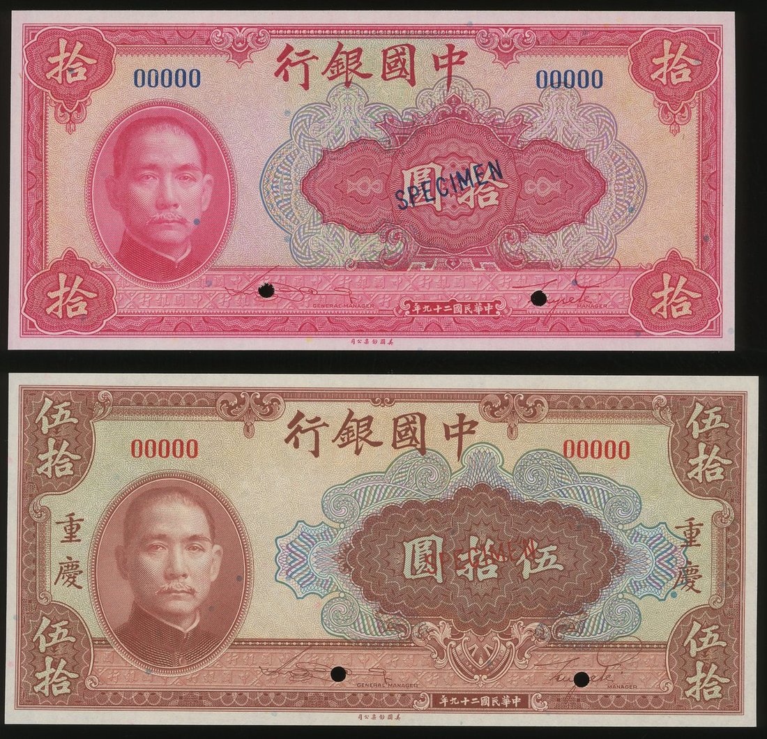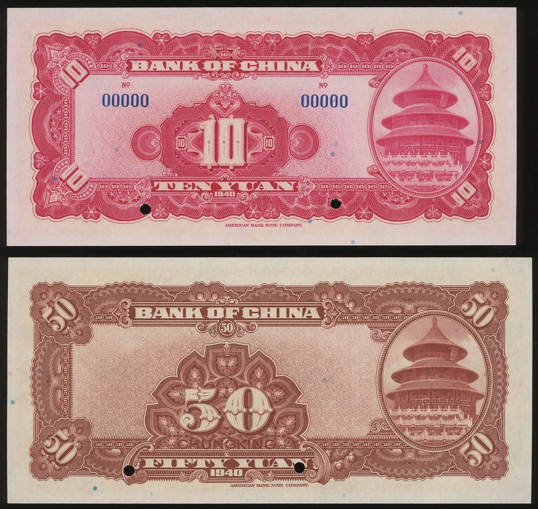 Bank of China, 10 Yuan specimen, 1940 and 50 Yuan specimen, Chungking, 1940, serial number 00000, red and brown respectively, printed by ABNC, hole punch cancelled,