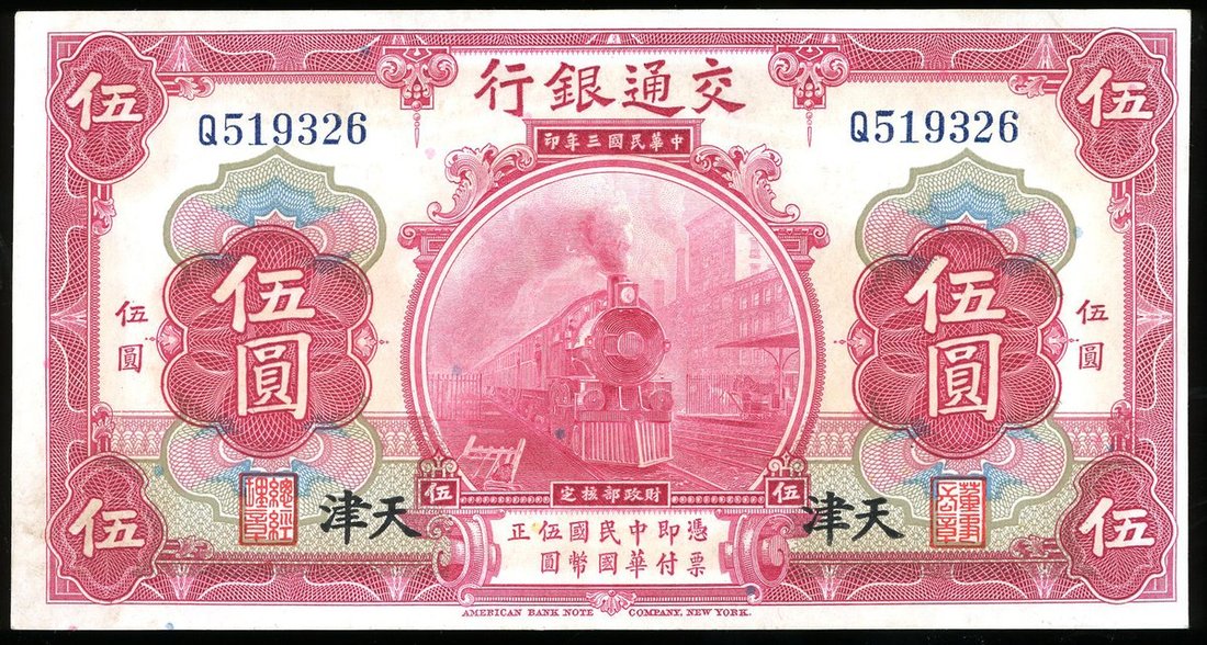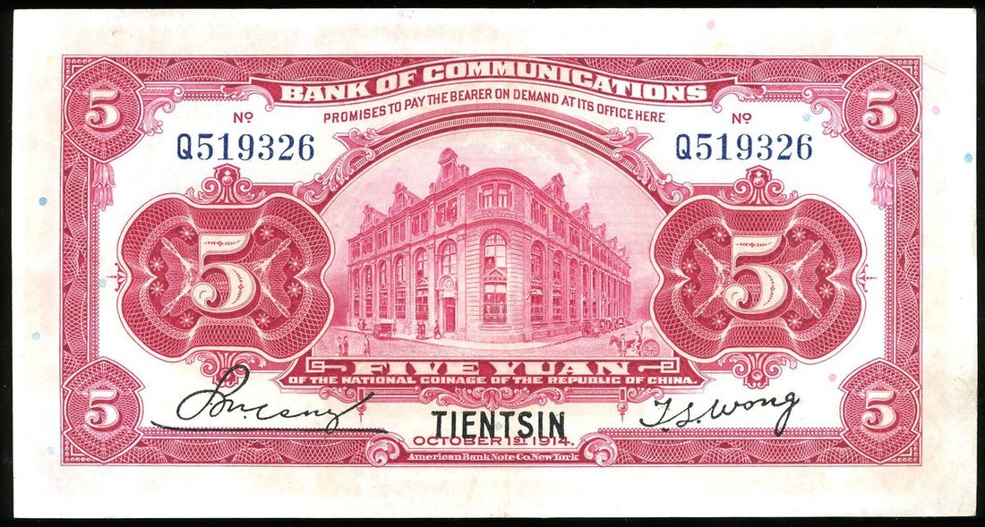 Bank of Communications, 5 Yuan, Tientsin, 1914, serial number Q519326, script signatures on reverse,