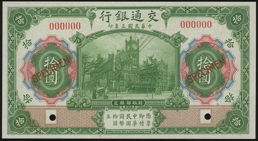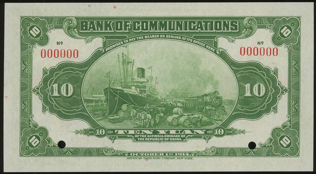 Bank of Communications, 10 Yuan specimen, 1914, serial number 000000, green, printed by ABNC, punch hole cancelled,