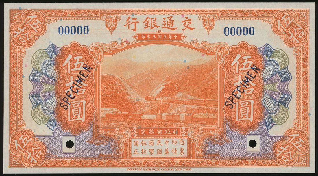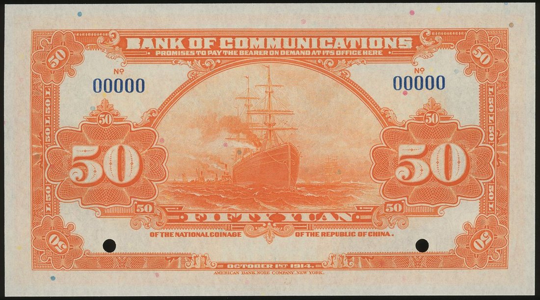 Bank of Communications, 50 Yuan specimen, 1914, serial number 00000, orange, printed by ABNC, punch hole cancelled,