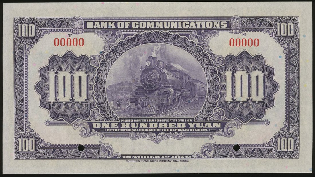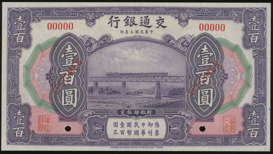 Bank of Communications, 100 Yuan specimen, 1914, serial number 00000, purple, printed by ABNC, punch hole cancelled,