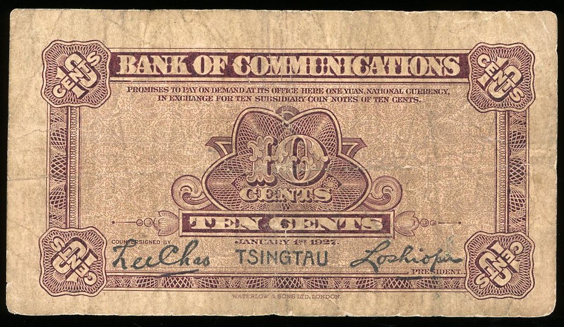 Bank of Communications, 1 chiao, Tsingtau, 1927, serial number A271034, (Pick 1416), very fine