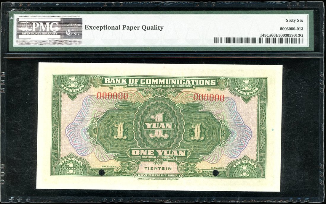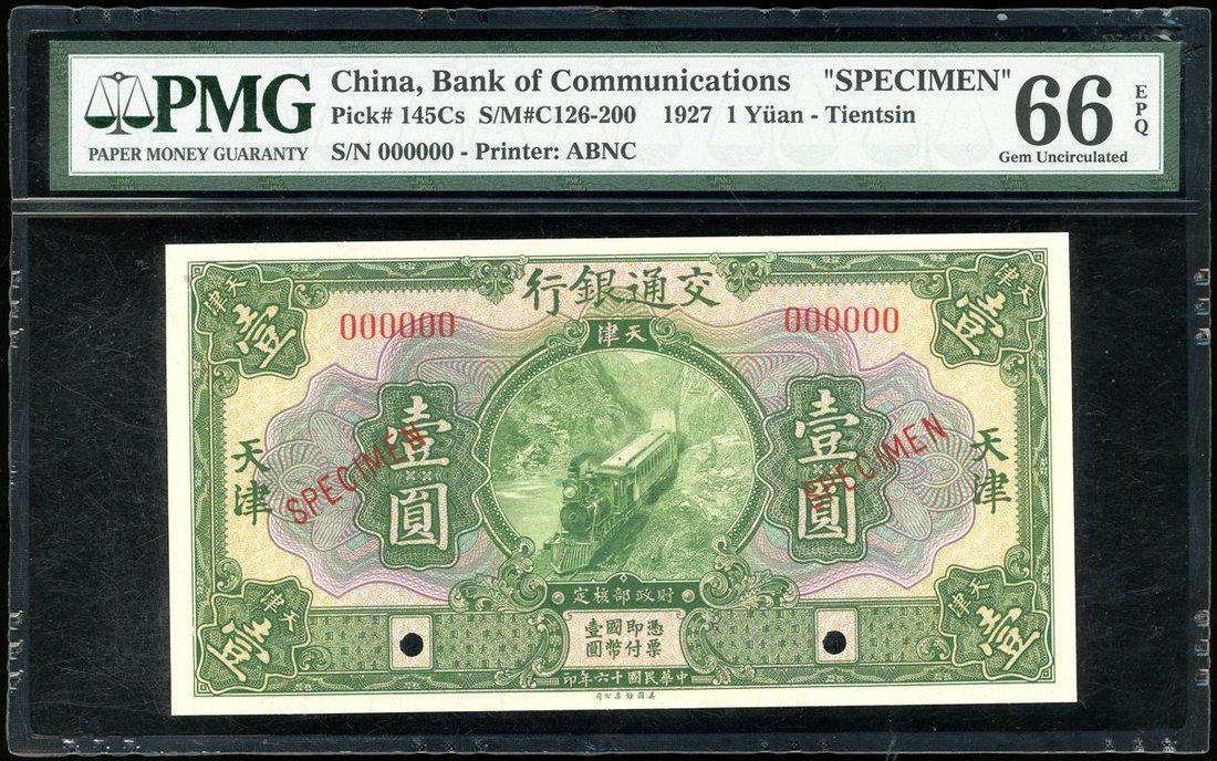 1927年交通銀行1元樣票,天津地名,PMG 66EPQ