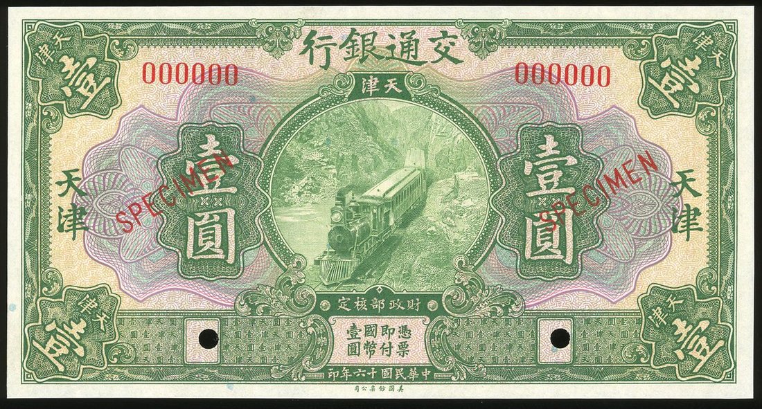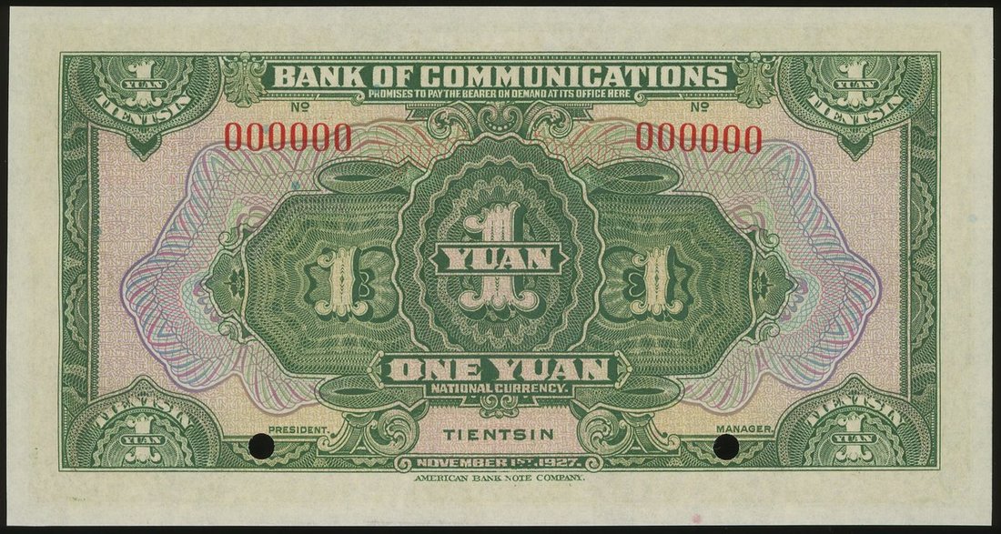 Bank of Communications, 1 Yuan specimen, Tientsin, 1927, serial number 000000, green, printed by ABNC, punch hole cancelled,