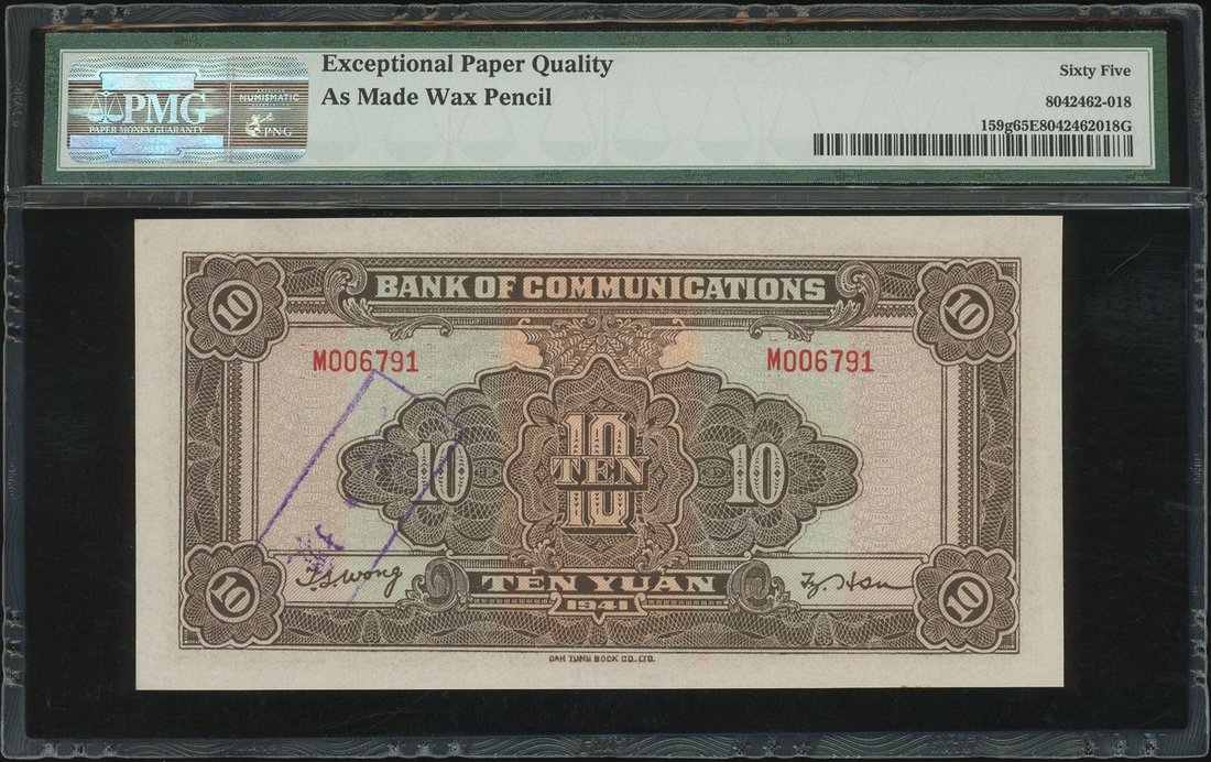 Bank of Communications, 10 Yuan, 1941, mismatching obverse and reverse serial numbers M006790/M006791, purple cancellation hand stamps,